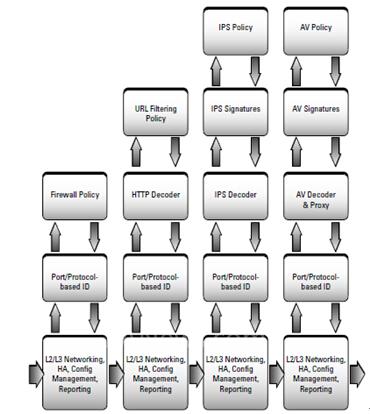 傳統(tǒng)的安全產(chǎn)品,尤其是那些捆綁的功能,每個(gè)高級(jí)安全功能是獨(dú)立執(zhí)行的。這種多通道方法需要低級(jí)包處理例程重復(fù)多次。系統(tǒng)資源使用效率低下并引入了顯著延遲(見圖4-5)。