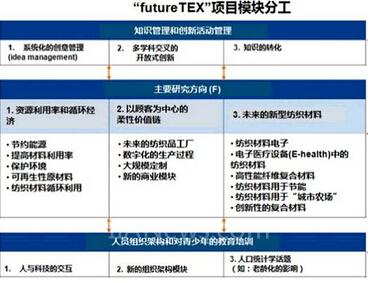 事實(shí)上,中國(guó)紡織業(yè)(以及許多其它行業(yè))都面臨相似的問(wèn)題:同質(zhì)化的傳統(tǒng)產(chǎn)品,中國(guó)制造的成本已很難和越南等國(guó)家競(jìng)爭(zhēng)。與此同時(shí),又缺乏創(chuàng)新性產(chǎn)品去搶占高端市場(chǎng)。這也是 “中國(guó)制造2025” 轉(zhuǎn)型升級(jí)的壓力所在。futureTEX針對(duì)的是紡織行業(yè),它只是德國(guó)本土工業(yè)4.0眾多行業(yè)應(yīng)用中的一個(gè)。但細(xì)細(xì)解剖,對(duì)中國(guó)工業(yè)極有啟示。盡管德國(guó)傳統(tǒng)行業(yè)面臨的壓力也不小。然而不同于國(guó)內(nèi)許多行業(yè)迫不及待地將工業(yè)4.0等同于“智能工廠”,德國(guó)對(duì)于傳統(tǒng)行業(yè)有著更加深入的思考。3futureTEX的三大研究方向德國(guó)紡織戰(zhàn)略futureTEX在項(xiàng)目模塊分工和研究方向上,有著無(wú)比清晰的描述。futureTEX項(xiàng)目明確提出,它的三大目標(biāo)是:1)提高資源利用率,推行循環(huán)經(jīng)濟(jì) ;2)打造以顧客為中心的柔性價(jià)值鏈 ;3)研發(fā)未來(lái)的新型紡織品材料。