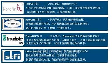 圖3 新材料項(xiàng)目示例(持續(xù)更新中)紡織材料的觸角已經(jīng)大為延伸,重要的是:跨界!這已經(jīng)遠(yuǎn)遠(yuǎn)超出了一般產(chǎn)業(yè)制定者甚至是行業(yè)跟蹤者的視野范疇。例如Norafin公司牽頭的TexPCB是致力于制造柔性印刷電路板,通過(guò)可再生材料,告別傳統(tǒng)的原材料思路;而大名鼎鼎的弗勞恩霍夫牽頭的PhotoTEX,則指向了太陽(yáng)能纖維。