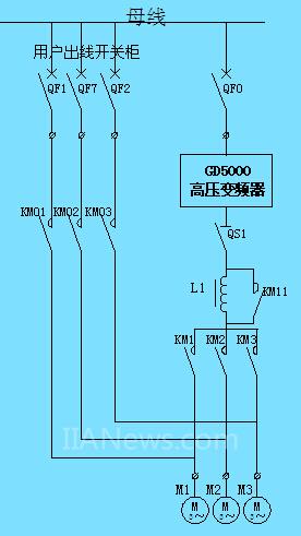 一拖三無擾切換有接觸器:KM1、KM2、KM3;KM01、KM02、KM03;手動刀閘QS1、勿擾卻換部分L1和KM11組成。旁路柜嚴格按照“五防”聯(lián)鎖要求設(shè)計,對應的變頻器輸出接觸器和旁路接觸器開關(guān)電氣閉鎖,同時只允許一臺變頻器進線接觸器開關(guān)閉合、同時只允許一臺變頻器出線接觸器開關(guān)閉合,完全能夠保證變頻調(diào)速系統(tǒng)安全運行。
