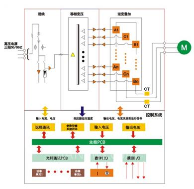 高壓變頻器是由多個單元串聯(lián)而成,通過將多個低壓功率模塊的輸出疊加起來得到高壓輸出。高壓變頻器的原理結(jié)構(gòu)如下圖所示。