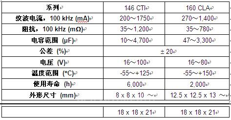 146 CTI系列電容器有9種外形尺寸,工作溫度高達(dá)+125℃,160 CLA系列有6種外形尺寸,可在+150℃高溫下工作。這些電容器通過(guò)了AEC-Q200認(rèn)證,100kHz下的阻抗低至35mΩ,能更好地進(jìn)行濾波,額定紋波電流為1750mA,使用壽命長(zhǎng)達(dá)6000小時(shí),可靠性很高。