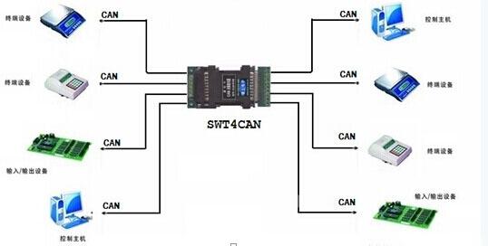 上圖中只需要在CAN總線的正中間接一個(gè)CAN交換機(jī)就可以解決所有支線長(zhǎng)度的限制。SWT4CAN的產(chǎn)品是一種4×4口CAN交換機(jī),上位機(jī)一側(cè)有4個(gè)CAN口,下位機(jī)側(cè)也有4個(gè)CAN口,上位機(jī)與下位機(jī)之間是相互隔離的。交換機(jī)可以將一個(gè)已經(jīng)連接的CAN網(wǎng)絡(luò)與另外一個(gè)CAN網(wǎng)絡(luò)進(jìn)行“多向互聯(lián)”。