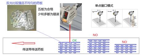 使用Q4X激光測(cè)距傳感器的單點(diǎn)窗口模式,設(shè)置合格的藥板數(shù)量為5, 此時(shí)有輸出信號(hào);如藥板數(shù)量大于5或小于5時(shí),則判斷為錯(cuò)誤,無(wú)輸出信號(hào)。被檢測(cè)物泡罩片均為高亮部件,Q4X對(duì)高亮部件檢測(cè)效果十分理想,且響應(yīng)速度快達(dá)1.5ms。