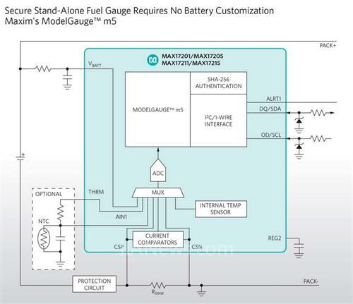 Maxim Integrated提供業(yè)界首款內(nèi)置SHA-256認(rèn)證的獨(dú)立電量計(jì),通過(guò)安全認(rèn)證防止假冒電池,可靠的ModelGauge m5算法檢測(cè)電池容量的微小變化,更加準(zhǔn)確地預(yù)測(cè)電池容量快速變小之前還能持續(xù)的時(shí)間。