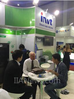 此次展會亮相的主要展品為英威騰明星逆變器MG,BG系列,還有BPD光伏水泵逆變器以及光伏揚水系統(tǒng)解決方案。泰國作為重要的農(nóng)業(yè)大國,對BPD光伏水泵解決方案的需求尤為突出。BPD光伏水泵逆變器,采用動態(tài)VI最大功率點跟蹤(MPPT)和電機控制相結(jié)合的技術(shù),響應(yīng)速度快,系統(tǒng)效率高、運行穩(wěn)定性好,適用于各種交流水泵。在展會現(xiàn)場,客戶仔細聽取了工作人員對BPD光伏水泵演示方案的介紹后,表達了高度的贊揚。一位客戶評價到:英威騰逆變器真正做到了響應(yīng)速度快,超低電壓啟動,為我們提高了不少效率。