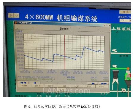從客戶處了解到,原煤倉每小時(shí)消耗大約 50T 的煤,消耗量比較均勻,那么從貼片式讀取的重量值變化也應(yīng)該是均勻的。由于貼片式系統(tǒng)已經(jīng)接入客戶的 DCS 系統(tǒng)中,我們從 DCS 系統(tǒng)持續(xù)觀察數(shù)據(jù),這個(gè)數(shù)據(jù)應(yīng)該也是變化均勻的。從圖 9 中可見,系統(tǒng)上料和用料的時(shí)候,重量值變化極為均勻,沒有跳變、丟失數(shù)據(jù)的現(xiàn)象。