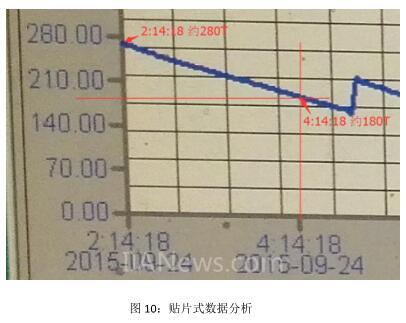 仔細(xì)觀察這個(gè)曲線圖(圖 10),我們截取一部分?jǐn)?shù)據(jù)來觀察:從凌晨 2:14 分到 4:14 分 2 個(gè)小時(shí)時(shí)間內(nèi),貼片式顯示的重量值據(jù)減少了 100T,這個(gè)和之前了解到的每小時(shí)消耗 50T 煤非常吻合??梢娰N片式重量料位計(jì)非常適合原煤倉的應(yīng)用