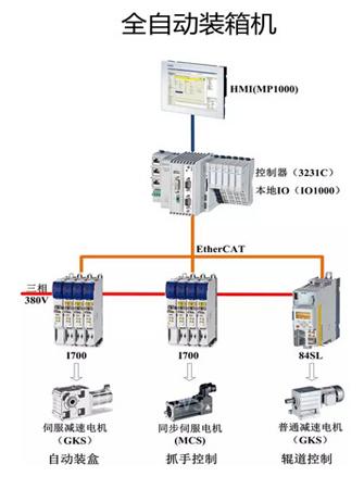 Lenze倫茨在全自動裝箱機上有整套的自動化解決方案。在硬件配置方面,首先控制器采用新一代運動控制器3231C作為系統(tǒng)控制核心元件,其次采用MCS高性能同步伺服電機作為設備的執(zhí)行機構,最后采用EtherCAT總線作為整個系統(tǒng)的通訊網(wǎng)絡。詳見下面圖1 系統(tǒng)網(wǎng)絡拓撲圖。