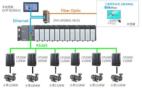 近期,臺達工業(yè)自動化成功協(xié)助中國大陸一座自來水廠建立穩(wěn)定、高效的水處理系統(tǒng)。該水廠的送水泵房共配備6座水泵,采用6臺臺達風機水泵專用變頻器CP2000系列進行同步控制,自動調(diào)節(jié)控制水泵啟停臺數(shù)與頻率,以實現(xiàn)優(yōu)化的末端供水需求與壓力的平衡。臺達解決方案系統(tǒng)架構(gòu)圖如下: