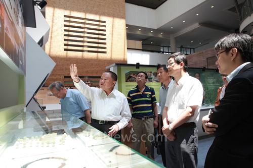 圖八 臺(tái)達(dá)環(huán)境與教育基金會(huì)董事長(zhǎng)鄭崇華先生 (左二)為參加啟動(dòng)會(huì)的嘉賓與媒體們介紹正在北京清華大學(xué)美術(shù)學(xué)院A座中庭舉行的“綠筑跡│臺(tái)達(dá)綠色建筑展”