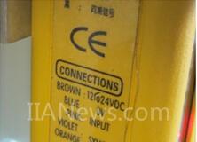 上圖是某安全光幕本體上的CE標(biāo)記,沒(méi)有眼花繚亂的字體特效,但被壓縮的字體結(jié)構(gòu)及不和諧的字母間距的使其元器件的合規(guī)性成疑;