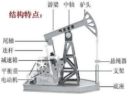磕頭機(jī)(圖1:磕頭機(jī) 來自網(wǎng)絡(luò))也就是游梁式抽油機(jī),因其工作時(shí)上下往復(fù)運(yùn)行,類似磕頭動(dòng)作,所以通常叫做磕頭機(jī)。主要由了驢頭-游梁-連桿-曲柄機(jī)構(gòu)、減速箱、動(dòng)力設(shè)備和輔助裝備等四大部分組成。工作時(shí),電動(dòng)機(jī)的傳動(dòng)經(jīng)變速箱、曲柄連桿機(jī)構(gòu)變成驢頭的上下運(yùn)動(dòng),驢頭經(jīng)光桿、抽油桿帶動(dòng)井下抽油泵的柱塞作上下運(yùn)動(dòng),從而不斷地把井中的原油抽出井筒。