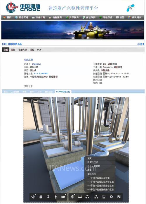 在該項(xiàng)目中,中海油首次將 BIM技術(shù)應(yīng)用于物業(yè)管理行業(yè),將大量設(shè)計(jì)建筑階段的數(shù)字化信息有效集成,直觀展示樓宇各類信息,為管理提供有效依據(jù),達(dá)到建筑資產(chǎn)的可視化管理。