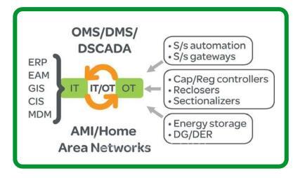 IT與OT的融合意味著以新的方式集合應(yīng)用程序和設(shè)備,并將原本孤立運行的系統(tǒng)捆綁在一起。隨著設(shè)備數(shù)量的增加以及IT與OT功能的增加,不同系統(tǒng)集合在一起帶來了全新的整合。要想應(yīng)對IT/OT集成配電網(wǎng)的需求,就要改進通信,遵守擴展化標(biāo)準(zhǔn),并聚焦體系結(jié)構(gòu)和安全性。