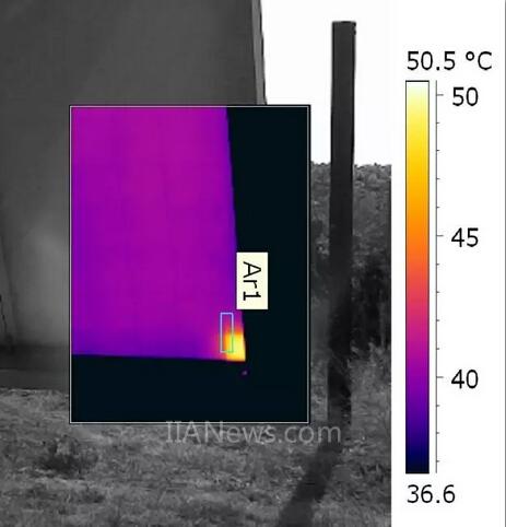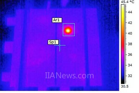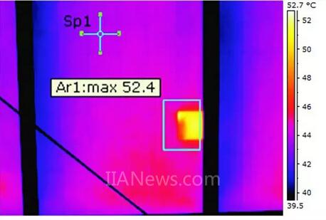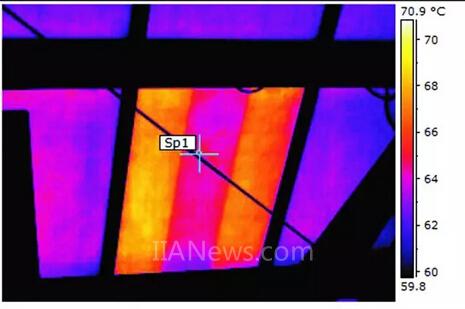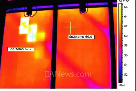 熱圖像顯示有兩根電池板出現(xiàn)熱點(diǎn),這表明旁路二極管出現(xiàn)破損。