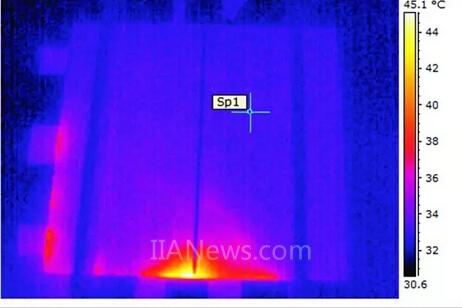 此熱圖像顯示,電池在邊緣隔離出現(xiàn)裂隙,導(dǎo)致局部分流的出現(xiàn)。