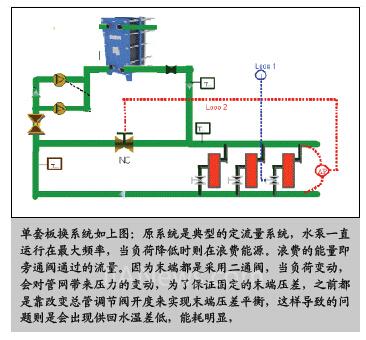 在一個能耗 P=ΔT * FM,在舊系統(tǒng)中,對于水泵而言,負荷變化的時候流量FM 保持不變,所以變化的始終是溫差ΔT。 就會造成系統(tǒng)負荷很小時候,溫差接近于1℃,甚至于0℃。 又出水溫度是不變的,所以回水溫度會降低。當系統(tǒng)采用變流量運行,系統(tǒng)流量扣除通過旁通閥部分的流量,實際流量為實際負荷側(cè)所引起,并不受水泵側(cè)控制,當采用變流量運行方式,實際流量的變化反應了實際負荷的變化,近似成正比改變,此時對于公式P=ΔT * FM而言,變化的就是FM,而ΔT 是不會有大的變化的。 因此在低負荷情況下,可以實現(xiàn)大溫差小流量。此時依據(jù)恒壓差的方式,保證末端負荷側(cè)始終有供水壓力。