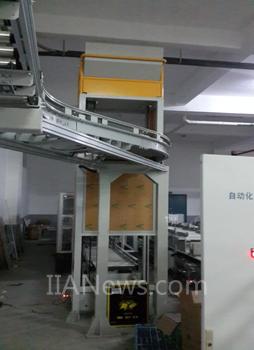 在該配送中心,二樓為倉(cāng)儲(chǔ)位置,件煙通過(guò)人工搬上傳送帶,由垂直傳送機(jī)構(gòu)送至一樓天橋傳輸帶。