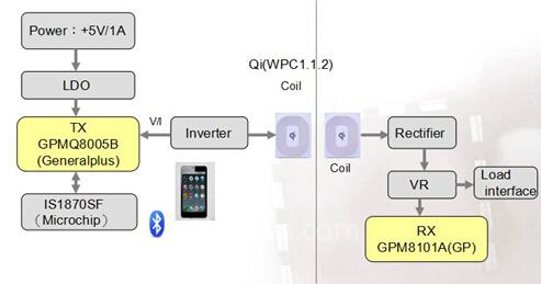大聯(lián)大品佳的Generalplus(凌通科技)的GPMQ8005B支持+5V/1A DC輸入,2.5W-3W輸出;支持QI(WPC1.1.2)標(biāo)準(zhǔn),支持A5/A11線圈;TX與RX耦合頻率在130KHz(不同廠家可能頻率可能不同,主要看線圈諧振電容值);支持BLE 4.0數(shù)據(jù)傳輸,同時(shí)支持iBeacon以及BeaconThings應(yīng)用;工作環(huán)境:-40℃---+85℃。