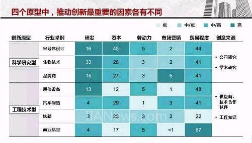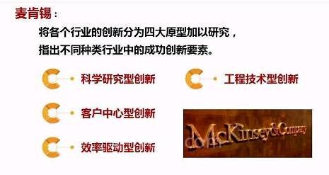 下面,我給大家介紹麥肯錫他們的分析,我覺得他們的這個分析對我們所有的制造業(yè),尤其是創(chuàng)新的制造業(yè)會有一定的借鑒意義。他們認(rèn)為,各個行業(yè)的創(chuàng)新有四大類型:科學(xué)研究型創(chuàng)新、工程技術(shù)型創(chuàng)新、客戶中心型創(chuàng)新和效率驅(qū)動型創(chuàng)新。