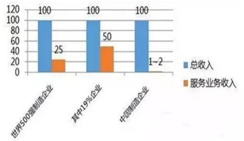 世界500強(qiáng)企業(yè)的25%的收入來自與服務(wù)收入,其中19%的企業(yè)其服務(wù)收入已經(jīng)達(dá)到總收入的50%。GE全球銷售收入的70%來自于“技術(shù)+服務(wù)+管理”的服務(wù)業(yè)務(wù)。而我國(guó)制造企業(yè)的服務(wù)收入只占總收入的1-2%(圖3)。