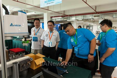 評(píng)委在比賽現(xiàn)場觀看來自臺(tái)灣的虎尾科技大學(xué)參賽團(tuán)隊(duì)演示結(jié)合各項(xiàng)臺(tái)達(dá)自動(dòng)化產(chǎn)品打造的智能彈性制造系統(tǒng)