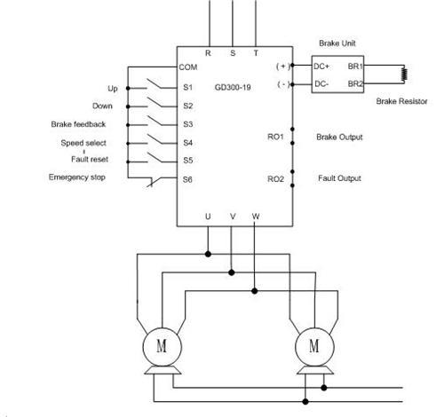 應(yīng)用過(guò)程中,主電機(jī)電路的驅(qū)動(dòng)設(shè)備為GD300-19變頻器,兩段運(yùn)行速度,一臺(tái)RO制動(dòng)信號(hào)用于電機(jī)的制動(dòng)控制。
