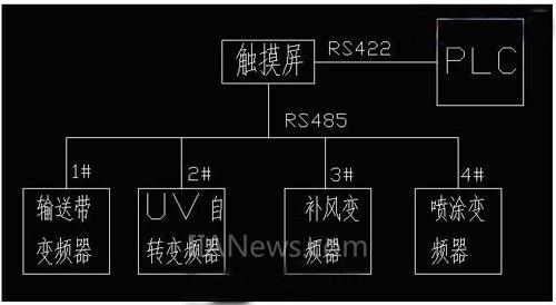 變頻器采用海利普C+系列0.4KW。邏輯動(dòng)作由三菱PLC控制觸摸屏通過com2控制4臺變頻器,由于三菱PLC只有一個(gè)RS422口,擴(kuò)展一個(gè)485品在成本上有所增加,所以用觸摸屏的com1與PLC交換數(shù)據(jù)。