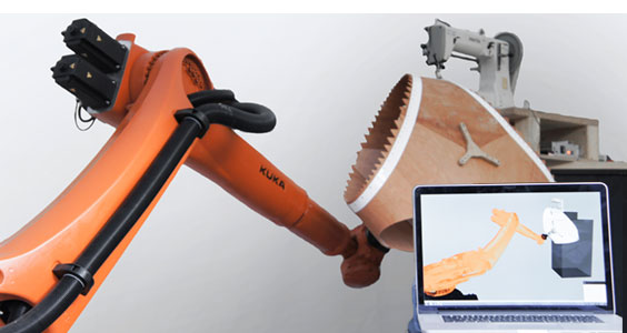 最初的材料是薄薄的貼面木條,然后被分別疊加成平整的膠合板。這樣能夠形成彈性結(jié)構(gòu)元件。完成這一流程步驟后,就要用到 KUKA 機器人。它在u以指定的幾何造型固定彎曲的膠合板條時提供了支持。在接下來的縫紉過程中,機器人將彎曲的板條穿過縫紉機,并將其拼接起來。借助一個專門編寫的軟件,將機器人和縫紉機的控制結(jié)合在一起。這個接口使得機器人始終能夠識別工件的當前位置及縫紉機的狀態(tài),并使其運動保持同步。