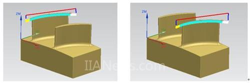 精加工策略。精加工的目的是為了保證良好的加工質(zhì)量和尺寸精度,精加工直接決定了實際的加工效果是否能夠達(dá)到實際需求。精加工時,分別采用不同的方法先加工葉片特征,后加工流道特征。葉片采用可變輪廓銑,曲面驅(qū)動方法,投影矢量為朝向驅(qū)動體,刀軸采用側(cè)刃驅(qū)動體,側(cè)傾角為10o,進(jìn)刀方式為線性-垂直于部件,切削參數(shù)為切削速度Vc=60m/min,每齒進(jìn)給量fz=0.04mm/Z,徑向切深ae=0.3mm,軸向切深ap=1.2mm。流道也采用可變輪廓銑,曲面驅(qū)動方法,投影矢量為朝向驅(qū)動體,刀軸采用垂直于驅(qū)動體。進(jìn)刀方式為圓弧-垂直于部件,切削參數(shù)為切削速度Vc=80m/min,每齒進(jìn)給量fz=0.04mm/Z,徑向切深ae=1mm,軸向切深ap=0.3mm。精加工過程中采用了WALTER整體硬質(zhì)合金刀具,精加工球頭刀具刀具牌號為H7073717-12-2。