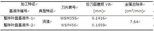 如上是兩種刀片加工基準(zhǔn)件的流道特征時后刀面磨損的測量結(jié)果,后刀面磨損VB為相應(yīng)刀具加工完流道特征后的后刀面磨損量,金屬去除率可利用切削參數(shù)計算得到。