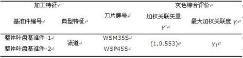 運用灰色關(guān)聯(lián)分析法對刀具性能進(jìn)行評價的關(guān)鍵在于計算出加權(quán)關(guān)聯(lián)矢量γ′,利用最大加權(quán)關(guān)聯(lián)度γi來決定相對最優(yōu)切削刀具。在基準(zhǔn)件流道特征的粗加工過程中,加權(quán)關(guān)聯(lián)矢量γ′=(1,0.553),最大加權(quán)關(guān)聯(lián)度γi=max(1,0.553)=γ1,所以刀片WSM35S的切削性能優(yōu)于刀片WSP45S。同時可知,兩種刀片金屬去除率相同,可直接通過后刀面磨損判斷刀具性能優(yōu)劣,但金屬去除率相同屬于巧合情況,并不影響粗加工評價模型針對一般情況的使用。
