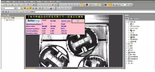 同時(shí),事實(shí)證明,康耐視強(qiáng)大的PatMax工具可以輕松應(yīng)對(duì)活塞的“骨節(jié)”特征查找,即使活塞毛坯面反光有一定的差異,有傾斜發(fā)生,PatMax工具依然可以準(zhǔn)確定位;再加上In-Sight視覺(jué)軟件強(qiáng)大的圖像預(yù)處理算法及計(jì)算處理能力,可以按照“骨節(jié)”凹槽的初定位(獲取X值、Y值),之后在凹槽的兩側(cè),判別小凸臺(tái)的位置,即凸臺(tái)在凹槽左邊還是右邊來(lái)判別0°角度和180°角度。這樣,就可以準(zhǔn)確地反映工件的中心坐標(biāo)及角度。