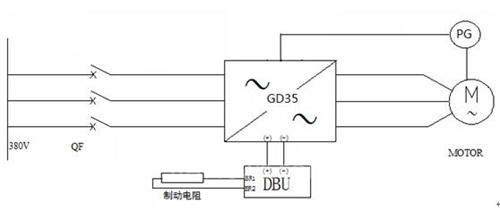 對于15kW的多級永磁同步電機(jī),充分考慮其啟動及運(yùn)行時的轉(zhuǎn)矩要求,可以為其放大兩檔選配變頻器,選配的型號為GD35-022-4。螺桿式抽油機(jī)需滿足快速啟停,有效制動,這樣變頻器的制動單元應(yīng)有較大的制動電流,縮短制動過程??蛻艨蛇x用DBU-055-4的制動單元,制動電阻大小為13.6?/9600W。整個變頻驅(qū)動系統(tǒng)的電氣接線如圖2所示。