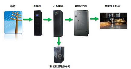 在精密機械加工行業(yè)廣泛應(yīng)用的汽車、航空、軌道交通、精密儀器設(shè)備等高端領(lǐng)域,為保證加工精度以及昂貴胚料的安全,加工設(shè)備對供電質(zhì)量有著極高的要求。對于普通配置的UPS電源來說,變頻器在拖動電動機正反轉(zhuǎn)時,電動機惰走時的動能轉(zhuǎn)換成電能回饋到電網(wǎng),其回饋能量的沖擊,導(dǎo)致UPS頻繁切換到旁路,失去了UPS的保護作用,甚至?xí)PS本身造成傷害,致使加工設(shè)備得不到有效的保護,造成加工刀具的損壞和胚料的報廢。