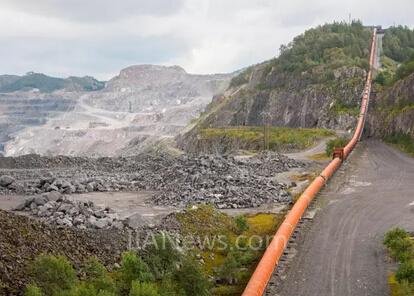 位于挪威索肯達爾的TitaniaA/S礦是世界大型露天鈦鐵礦,自1960年開始運營,每年產量近850,000公噸。用了15年的輸送機將鈦鐵礦石從破碎機運到山下貯倉儲存起來,然后經過壓碎、混合、磨粉,生產出鈦白粉(TiO2),這種粉末作為產品增白劑,從顏料到牙膏都有使用。