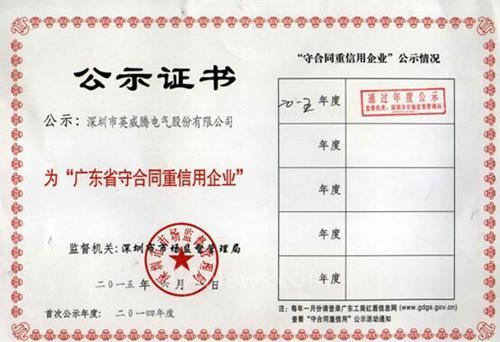 近日,廣東省工商行政管理局發(fā)布2015年度全國"守合同重信用"企業(yè)公告,我公司獲得2014-2015年度全國"守合同重信用"企業(yè)榮譽稱號,這是我公司繼2014年后,連續(xù)兩年獲得"重合同守信用"企業(yè)。獲此榮譽是各級工商行政管理機關(guān)對英威騰電氣一直堅持誠信、守法經(jīng)營的肯定。