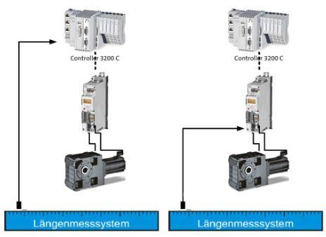 在有一定要求的應(yīng)用場合,除行走電機(jī)伺服控制外,還需接入外部位置傳感器的實(shí)現(xiàn)全閉環(huán)控制,保證控制精度,通常外部位置傳感器為激光測距、條碼讀取或拉繩編碼器等。Lenze 方案可按以下兩種方式實(shí)現(xiàn),外部位置傳感器接入控制器和接入驅(qū)動(dòng)器。