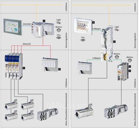 針對項(xiàng)目不同的功能需求,可選擇基于控制器或基于驅(qū)動(dòng)的控制方式或混合搭配控制。在獨(dú)立的功能區(qū)域,基于驅(qū)動(dòng)控制方式可獨(dú)立完成模塊功能,不受上位機(jī)影響,在故障或緊急情況下保障設(shè)備運(yùn)行到安全狀態(tài);基于控制器控制方式,可統(tǒng)籌全面集中控制,便于多軸協(xié)調(diào)運(yùn)動(dòng)等。