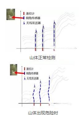 通過(guò)上圖我們可以看出,液位計(jì)用于檢測(cè)土壤和巖層間的液位,傾角傳感器用于檢測(cè)山坡的變化坡度,從而對(duì)山體做出監(jiān)測(cè)。但兩者的缺點(diǎn)是對(duì)現(xiàn)場(chǎng)安裝的要求比較高,同時(shí)需要布置較多數(shù)量的傳感器,施工量和成本比較高。