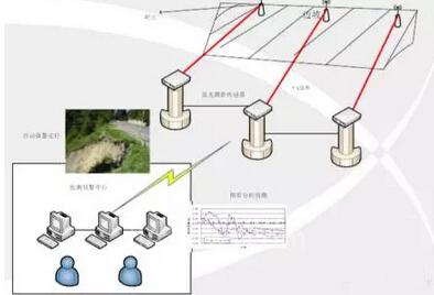 每個(gè)激光測(cè)距儀對(duì)應(yīng)一個(gè)靶點(diǎn),當(dāng)山體滑坡時(shí),靶點(diǎn)位置移動(dòng),激光測(cè)距儀的 輸出會(huì)發(fā)生變化。該方法的缺點(diǎn)是激光檢測(cè)受環(huán)境影響較大,例如大霧或者有阻擋物時(shí)就無(wú)法準(zhǔn)確檢測(cè),容易誤報(bào)警。