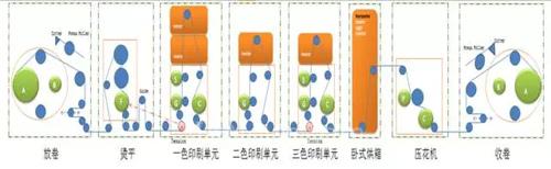 雙工位放卷→燙平機(jī)構(gòu)→印刷組單元(圓網(wǎng)與凹印)→(臥室烘箱→壓花機(jī))或雙工位收卷