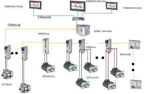 Lenze倫茨提出以中央運(yùn)動控制器3200 C為核心的自動化控制系統(tǒng)方案。在顯示層采用獨(dú)立的HMI p300控制器,在控制層采用I/O 1000和3200 C的完美組合可執(zhí)行所有邏輯控制。在驅(qū)動層采用具有緊湊性和高靈活性的創(chuàng)新型伺服驅(qū)動器i700以及結(jié)構(gòu)緊湊、動態(tài)響應(yīng)性好且采用可插拔鏈接設(shè)計(jì)的MCS和MCA電機(jī),更可靠地實(shí)現(xiàn)高精度運(yùn)動控制功能。基于運(yùn)動控制器的3200 C運(yùn)動控制系統(tǒng)可以為更復(fù)雜、更精密的設(shè)備提供更完美的控制,在很大程度上能提高設(shè)備的控制性能,邏輯控制和運(yùn)動控制不再分家,而是由同一套編程軟件PLC Designer來完成,不再為運(yùn)動控制和邏輯控制的配合而擔(dān)憂??刂葡到y(tǒng)采用板載的高性能實(shí)時總線系統(tǒng)EtherCAT,其協(xié)議處理完全在硬件中進(jìn)行,通過總線可以形成超高速控制回路,使網(wǎng)絡(luò)性能達(dá)到了一個新境界,實(shí)現(xiàn)傳統(tǒng)的現(xiàn)場總線系統(tǒng)無法企及的控制理念。