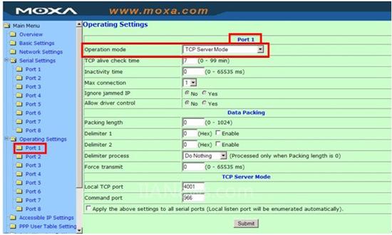 3. 更改配置頁面中Operation mode項(xiàng)目,選擇為“TCP Server Mode”即可。