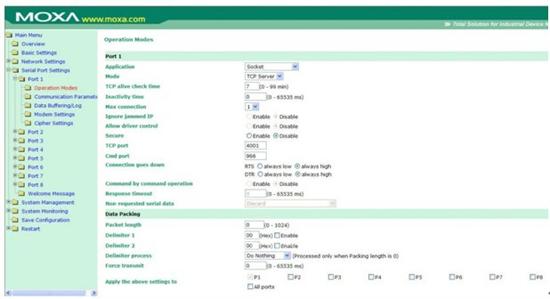 2. 進(jìn)入到配置頁面: Main Menu -->Serial Port Settings --> Port n (這里的"n"表示需要配置的端口在NPort上的序號(hào),例如:第一個(gè)口為port 1 ) --> Operation Modes ;