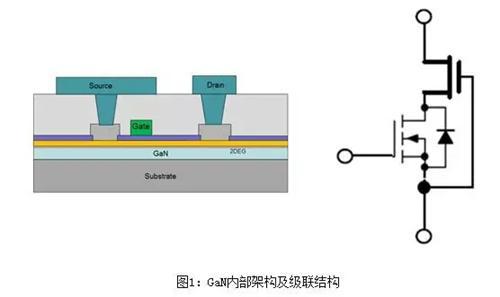 Cascode相當于由GaN HEMT和低壓MOSFET組成:GaN HEMT可承受高電壓,過電壓能力達到750 V,并提供低導通電阻,而低壓MOSFET提供低門極驅(qū)動和低反向恢復。HEMT是高電子遷移率晶體管的英文縮寫,通過二維電子氣在橫向傳導電流下進行傳導。