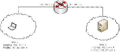 處于不同IP網段的以太網設備需要通信,中間必須有路由設備連接兩個不同IP網段的網絡,如圖1所示。路由器連接網絡A和網絡B,網絡A的網絡地址為,子網掩碼;網絡B的網絡地址為,子網掩碼;路由器在A、B兩個網絡各有一個IP地址,連接網絡A的IP為,連接網絡B的IP為,因此網絡A中的設備如果希望與網絡B中設備通信,需要將IP地址設置為自己的網關地址,同樣網絡B中的設備如果需要往網絡A中的設備返回消息,也需要將IP地址設置為自己的網關地址。