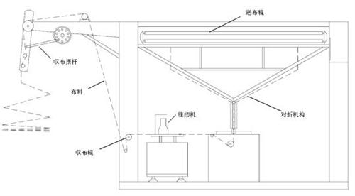 自動(dòng)對(duì)折縫邊機(jī)整體結(jié)構(gòu)如圖3所示,布料由送布輥運(yùn)送至對(duì)折機(jī)構(gòu)處,將一整塊大的布料進(jìn)行對(duì)折之后送至縫紉機(jī)處對(duì)需要縫補(bǔ)的邊緣處進(jìn)行快速縫補(bǔ)。収布輥起到將縫紉的布料往前拉動(dòng)的作用,布料經(jīng)過(guò)縫補(bǔ)后,經(jīng)由収布擺桿整齊地鋪疊擺放在最終収布平臺(tái)上。
