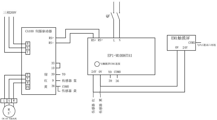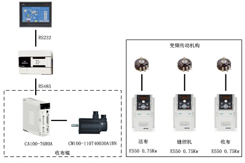 本方案中的控制系統(tǒng),采用EM1系列HMI實(shí)現(xiàn)人機(jī)交互,送料、縫紉機(jī)、收布電機(jī)的控制采用E550系列變頻器,而收布輥傳動(dòng)機(jī)構(gòu)采用CA100伺服系統(tǒng),EP1系列PLC對(duì)整個(gè)工藝過(guò)程進(jìn)行集中控制?;竟ぷ髟頌椋篐MI完成運(yùn)行參數(shù)的設(shè)置和顯示,PLC通過(guò)通訊讀寫(xiě)CA100伺服系統(tǒng)的內(nèi)部位置參數(shù),伺服系統(tǒng)根據(jù)外部縫紉機(jī)端的接近開(kāi)關(guān)信號(hào)來(lái)控制電機(jī)實(shí)現(xiàn)內(nèi)部位置的反復(fù)行走,帶動(dòng)拉布輥將布行走。